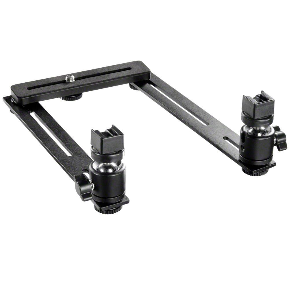 Schienensystem aus Metall zum Montieren einer Kamera und zweier Systemblitze