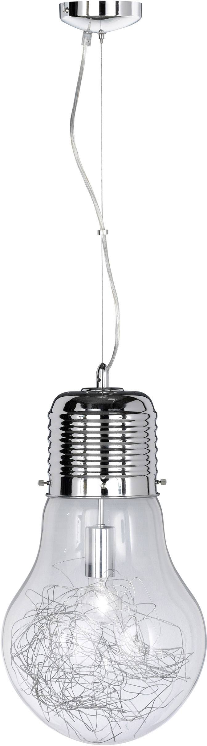 Die Pendelleuchte FUTURA in Chrom gleicht einer überdimensionierten Glühbrine. Durch das innenliegende Drahtgeflecht wird das Licht angenehm abgeblendet.