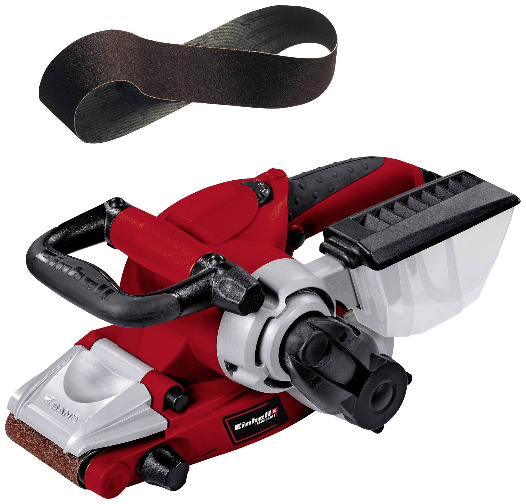 Mit dem Einhell Bandschleifer TE-BS 8540 E haben ambitionierte Heimwerker ein hochwertiges, leistungsstarkes Schleifgerät im Werkstatt-Sortiment, das flexibles, effektives Schleifen ermöglicht. Die Drehzahl-Elektronik erlaubt material- und anwendungsgerechtes Arbeiten. Der äußerst präzise Bandlauf lässt sich mittels Feinjustierung optimal einstellen, die Schleifbänder sind dank des Arretierhebels im Handumdrehen und werkzeuglos gewechselt. Der Softgrip und der ebenfalls werkzeuglos verstellbare Zusatzhandgriff des TE-BS 8540 E bieten hervorragende Ergonomie und hohen Bedienkomfort. Die Frontabdeckung lässt sich hochklappen, um auch randnahe Flächen bearbeiten zu können. Für staubarmes Arbeiten ist der Bandschleifer mit einer integrierten Staubabsaugung sowie einem Adapter für eine externe Staubabsaugung ausgestattet. Nach vollbrachter Arbeit lässt sich das aufgewickelte Kabel per Kabelclip fixieren, sodass der TE-BS 8540 E im Nu ordentlich verstaut ist. Damit die Arbeit sofort beginnen kann, ist ein Schleifband (P80) im Lieferumfang enthalten.