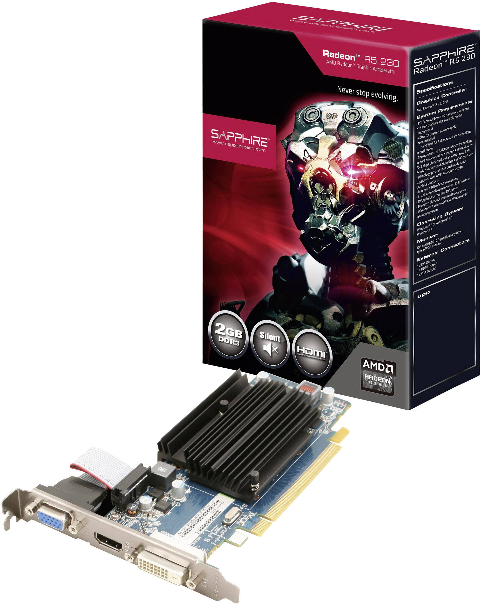 Die SAPPHIRE R5 230 2 GB ist eine Low-Profile-Grafikkarte, die keine zusätzliche Stromversorgung benötigt. Dadurch eignet sie sich ideal für Einsteiger-Systeme oder für die Aufrüstung bestehender PC-Systeme. Sie verfügt über 160 Stream-Prozessoren, einen Chiptakt von 625 MHz und 2GB DDR3-Speicher. Die Ausgänge Dual-Link-DVI, VGA und HDMI bieten Unterstützung für eine Auswahl von Monitortypen. Als Zubehör liegt der Grafikkarte ein Low-Profile-Bracket bei. Somit kann sie sowohl in Standard- als auch in Low-Profile-Gehäusen eingesetzt werden.