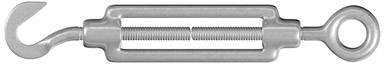 Zum Spannen von Seilen. Seil wird durch die Öse gezogen. Durch Drehen des Hakens wird über die Gewinde die Spannung erhöht oder gelöst.