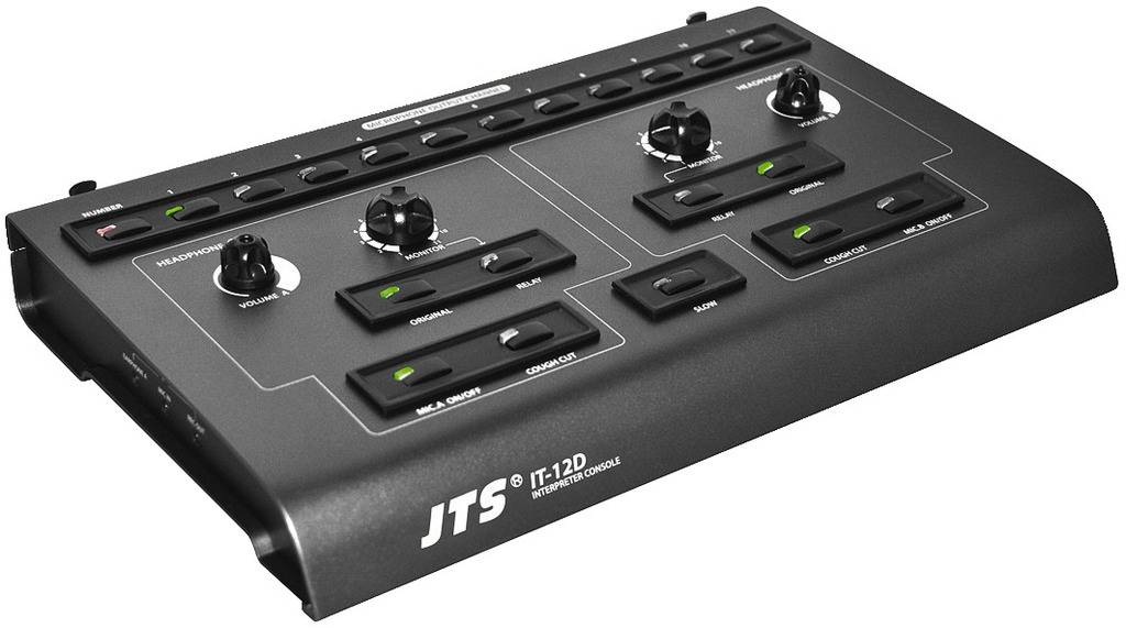 Dolmetscher-Konsole Die perfekte Ergänzung zum Basisgerät IT-12M. Bis zu 11 Dolmetscher-Konsolen können über ein 25-poliges D-SUB-Kabel kaskadiert werden. Als Grundausstattung liegt jeder Konsole ein 3-m-Kabel bei. Das IT-12D unterstützt zwei Kanäle. Dabei ist immer nur ein Kanal aktiv, der andere dient als Standby-Kanal, auf den bei Bedarf umgeschaltet werden kann. Die gewünschten Übersetzungskanäle können an der Konsole dauerhaft gespeichert werden. Der zuletzt aktive Kanal bleibt nach dem Abschalten der Betriebsspannung erhalten und steht nach dem Einschalten sofort wieder zur Verfügung. Zwei Simultan-Dolmetscher/Kommentatoren können gleichzeitig an der IT-12D über den aktiven Kanal arbeiten. Multimedia-Headsets aus unserem Lieferprogramm können problemlos über die Buchsen an der Geräteseite angeschlossen werden. Die Lautstärke der Kopfhörer kann für jeden Übersetzer individuell eingestellt werden. Die Mikrofone lassen sich bei Bedarf entweder komplett abschalten oder kurzzeitig muten (Räuspertaste). Über zwei zusätzliche symmetrische XLR-Buchsen können weitere Mikrofone angeschlossen werden. Der angewählte Sprachkanal erhält gleichzeitig die Summe aller Mikrofone, sofern diese aktiv geschaltet wurden. Relais-Übersetzungen, bei denen der Dolmetscher eine andere Sprache als die Saalsprache zum Übersetzen benötigt, werden mit Hilfe eines 11-stufigen Sprach-Wahlschalters ermöglicht. Eine schnelle Umschaltung zwischen Relais- und Saalsprache erfolgt über geräuscharme Taster. Sämtliche Taster geben eine optische Rückmeldung über ihren aktuellen Status. Eine häufig gewünschte Protokollierung der Übersetzung ist über zwei Record-Ausgänge möglich. Um die Sprechgeschwindigkeit des Vortragenden zu beeinflussen, steht dem Dolmetscher eine Taste zur Verfügung, die ein Slow-Down-Signal am Basisgerät auslöst. Die Spannungsversorgung des IT-12D erfolgt bequem über das Basisgerät, sodass ein klar strukturierter Aufbau, ohne Kabelwirr