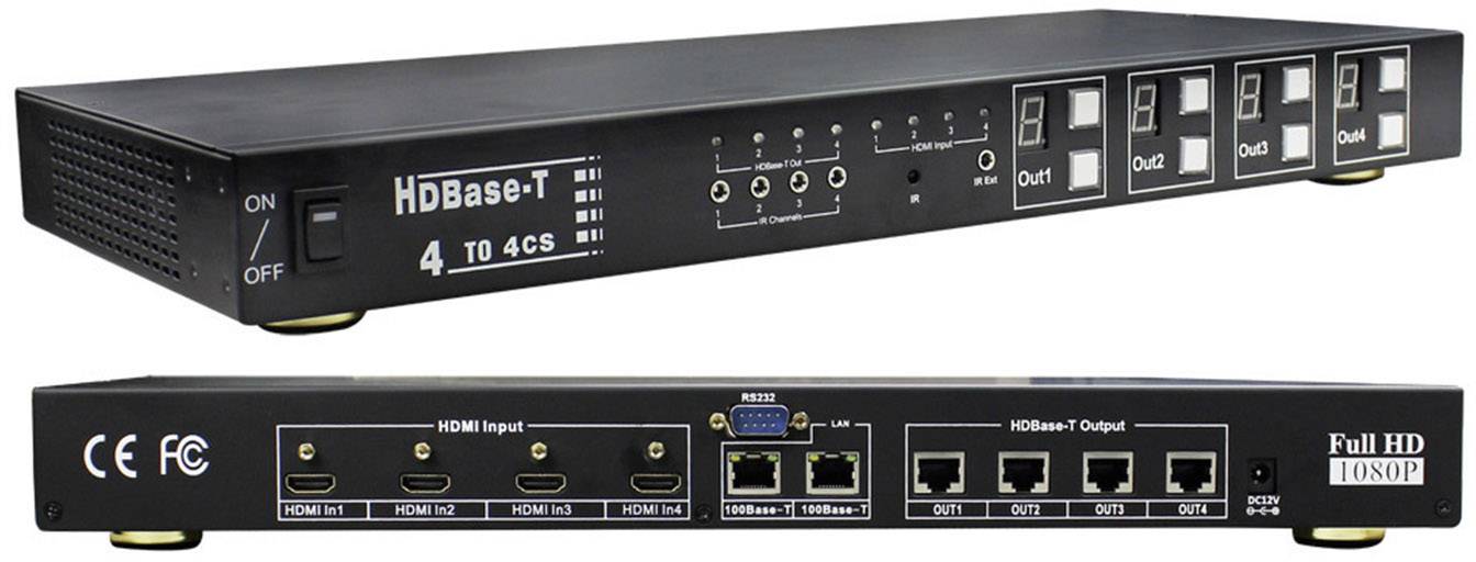 4 HDMI-Eingänge, 4 HD-Base-T Ausgänge