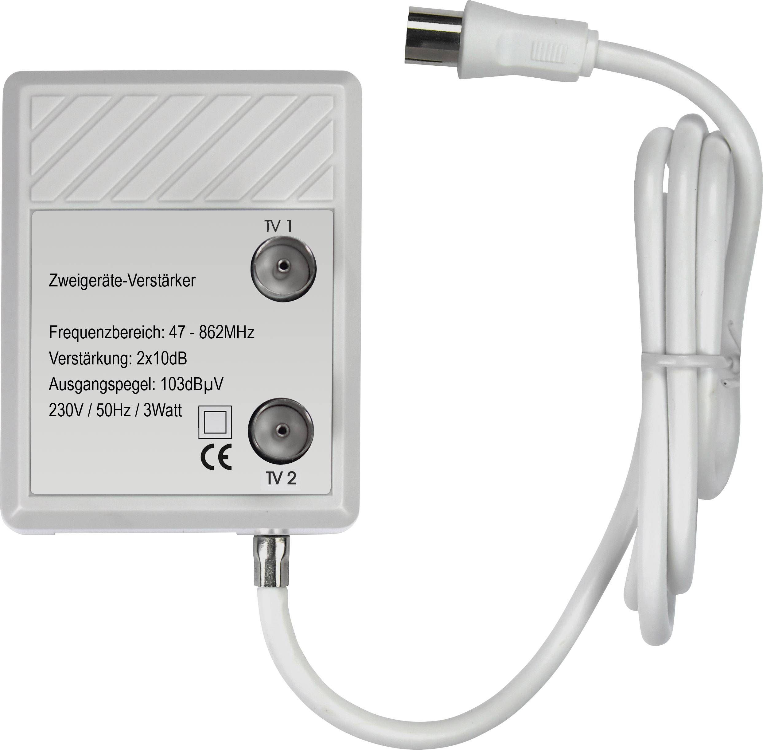 1 Eingang - 2 Ausgänge · fest angeschlossene Zuleitung ca. 95 cm · Maximaler Ausgangspegel 103 dBµV · Kabelnetztauglich · Integriertes Netzteil 230 V · Leistungsaufnahme: 2,5 W · Kunststoffgehäuse · HF-dicht.