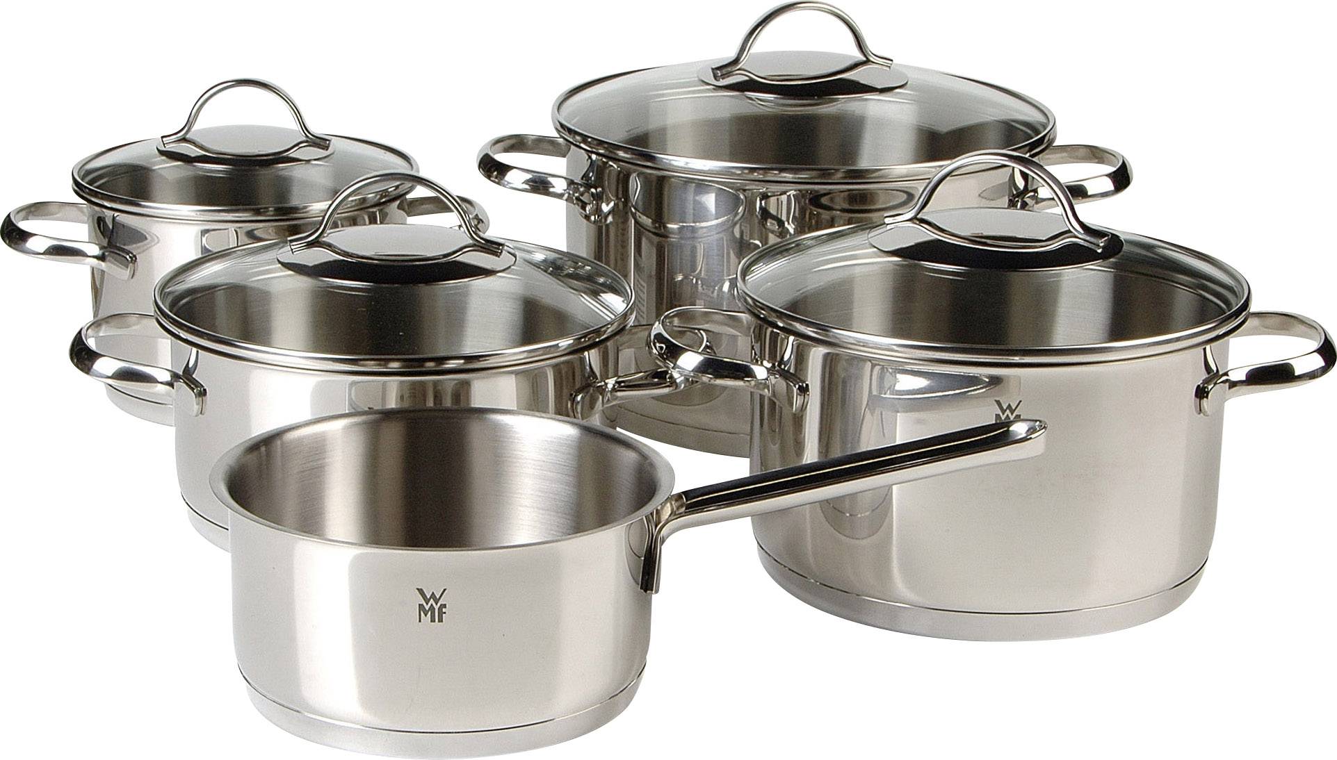 Bratentopf 20 cm (mit Deckel) + Fleischtopf 16 cm (mit Deckel) + Fleischtopf 20 cm (mit Deckel) + Fleischtopf 24 cm (mit Deckel) + Stielkasserolle (ohne Deckel).