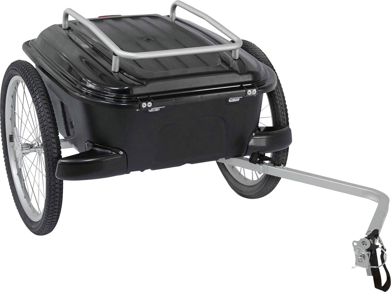 Der Hartschalenkoffer Carry All Box vom Experten M-Wave gehört zu den Premiumprodukten unter den Gepäckanhängern für Fahrräder. Der optisch attraktive und trotzdem robuste Fahrradanhänger ist wasserdicht und hat ein Fassungsvermögen von 70 Litern! Ein Dachgepäckträger (auf dem Deckel des Koffers) bietet weitere Transportmöglichkeiten. Die Box lässt sich abschließen. Der Rahmen, die Felgen und die Naben sind aus leichtem und steifem Aluminium, was für ein spielerisches Handling des Anhängers sorgt und ihn auch als Handwagen interessant macht. Dank Schnellverschlüssen bei den Laufrädern und der Deichsel kann der Anhänger in wenigen Sekunden auf circa die Größe der Box reduziert werden. Ein Transport im Auto sollte bei Bedarf also kein Problem darstellen, ein Winterlager im Keller sollte auch zu finden sein.