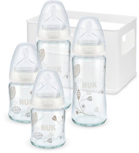 NUK First Choice Plus Starter Set Glas, mit 4 Babyflaschen inkl. Silikon-Trinksaugern und Flaschenbox, 0-6 Monate