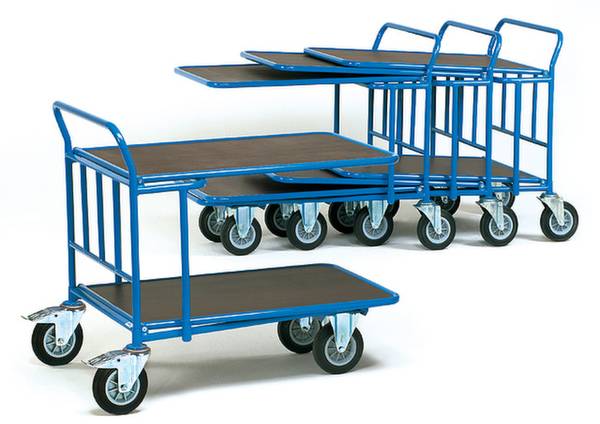 Raumspar-Wagen - Traglast 500 kg - Ineinanderschiebbare Wagen - 75% Stellraum-Einsparung. Ladefläche: - Rutschsichere Siebdruckplatte aus wasserfestem Sperrholz. Gestell: - Geschweißte Stahlkonstruktion - Oberfläche pulverbeschichtet - Dauerhaft oberflächengeschützt, schlag- und kratzfest. Bereifung: - Räder mit Vollgummi-Bereifung auf Kunststofffelge - Lenkrollen mit Feststeller.