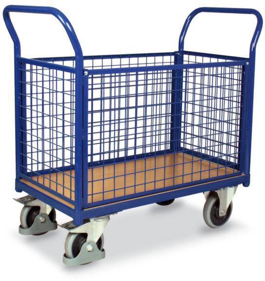 System-Plattformwagen - mit 4 Wänden Gestell: - Geschweißte Stahlkonstruktion - Oberfläche pulverbeschichtet - Dauerhaft oberflächengeschützt, schlag- und kratzfest. Ladefläche: - Holzwerkstoffplatte in Buchedekor. Aufbauten: - 4 Wände aus Drahtgitter - Längswände herausnehmbar. Bereifung: - 2 Lenk- und 2 Bockrollen mit spurloser thermoplastischer Gummi-Bereifung Ø 200 mm - Lenkrollen mit Feststellern und Fußschutz - Naben mit Kugellager.