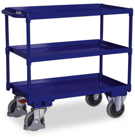 Tischwagen - 3 Etagen mit Blechböden Etagen: - Ladeflächen aus Stahlblech, öldicht verschweißt, Rand 40 mm hoch - Traglast mittlere und obere Etage 200 kg. Gestell: - Geschweißte Stahlkonstruktion - Oberfläche pulverbeschichtet - Dauerhaft oberflächengeschützt, schlag- und kratzfest. Bereifung: - 2 Lenk- und 2 Bockrollen mit spurloser thermoplastischer Gummi-Bereifung - Lenkrollen mit Feststellern und Fußschutz. Zentrales Fußbremssystem Easy STOP - Blockierung beider Lenkräder mit einem Pedal - Feststellen in jeder Radstellung möglich - Einfache Betätigung, auch mit Sicherheitsschuhen - Einstellbare Bremswirkung - Abbremsmöglichkeit des Wagens während der Fahrt.