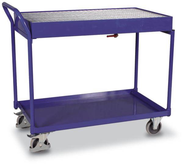 Tischwagen - mit Auffangwanne Etagen: - Obere Etage mit 100 mm hoher Auffangwanne aus Stahlblech, öldicht verschweißt, Volumen 60 Lite - Boden mit konischem Ablauf und Ablaufhahn 1/4" - Gitterrost, Maschenweite 30 x 30 mm, oben bündig lose eingelegt - Untere Etage Stahlblechwanne 25 mm hoch, öldicht verschweißt. Gestell: - Geschweißte Stahlkonstruktion - Oberfläche pulverbeschichtet - Dauerhaft oberflächengeschützt, schlag- und kratzfest. Bereifung: - 2 Lenk- und 2 Bockrollen mit spurloser thermoplastischer Gummi-Bereifung Ø 125 mm - Lenkrollen mit Feststellern und Fußschutz.