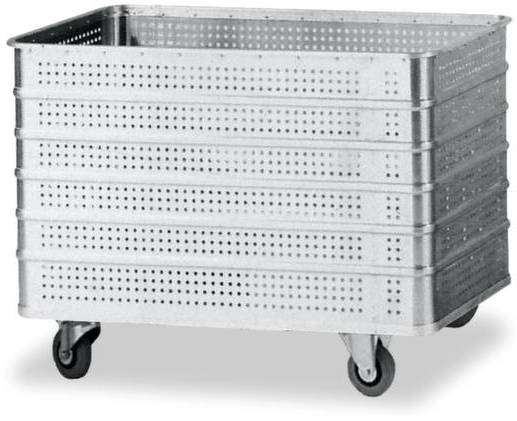 Alu-Kastenwagen - Aufbauten: - Wände mit umlaufenden, trapezförmigen Sicken, zur Verstärkung umlaufende Preßprofile am oberen und unteren Wagenrand - Wände und Boden gelocht (Ø 10 mm). Ladefläche: - Gelochter Boden, durch Fahrwerkprofile unterstützt. Bereifung: - Fahrwerk mit 2 Lenk- und 2 Bockrollen in Rechteckanordnung mit spurloser Vollgummi-Bereifung - Lenkrollen mit Feststeller - Nabe mit Rollenlager und Fadenschutz - Verzinkte Stahlgabeln. Auf Anfrage: - Weitere Größen.
