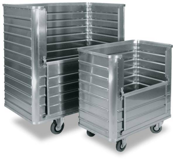 Alu-Kastenwagen - mit abschließbarem Deckel Aufbauten: - Wände mit umlaufenden, trapezförmigen Sicken, zur Verstärkung umlaufende Preßprofile am oberen und unteren Wagenrand - Eine Seitenwand bis zur Hälfte der Höhe klappbar, daurch ein bequemes Be- und Entladen bei Nutzung der vollen Ladehöhe - Mit Deckel und 2 Zylinderschlössern (inkl. 4 Schlüsseln) - Deckel anschaniert. Ladefläche: - Glatter Boden, durch Fahrwerkträger unterstützt. Bereifung: - Fahrwerk mit 2 Lenk- und 2 Bockrollen in Rechteckanordnung mit spurloser Vollgummi-Bereifung - Lenkrollen mit Feststeller - Nabe mit Rollenlager und Fadenschutz - Verzinkte Stahlgabeln. Auf Anfrage: - Weitere Größen.