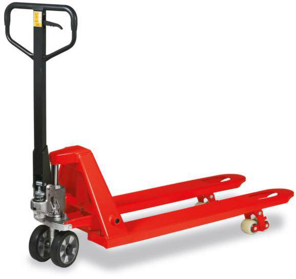 Traglast 2500 kg, Verstärkte Deichsel mit ergonomischem Deichselgriff, der die Funktionen Heben-Fahren-Senken beinhaltet, Gabeln für verwindungsfreie Stabilität aus einem Stück gepresst, Hydraulik mit gehärteten, geschliffenen und hartverchromten Kolben, Rollen: Lenkräder Vollgummi, Gabelrollen Polyurethan, einfach, Lenkräder Ø x B = 180 x 50 mm, Gabelrollen Ø x B = 85 x 98 mm, Kletterrollen an den Gabelspitzen.