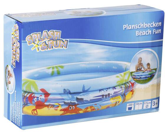 Splash und Fun Planschbecken Beach Fun. Aus langlebigem PVC. Materialdicke: 0,22/0,18mm. 535 Liter Fassungsvermögen. Maße aufgeblasen:175x30cm. Für Kinder ab 3 Jahren.