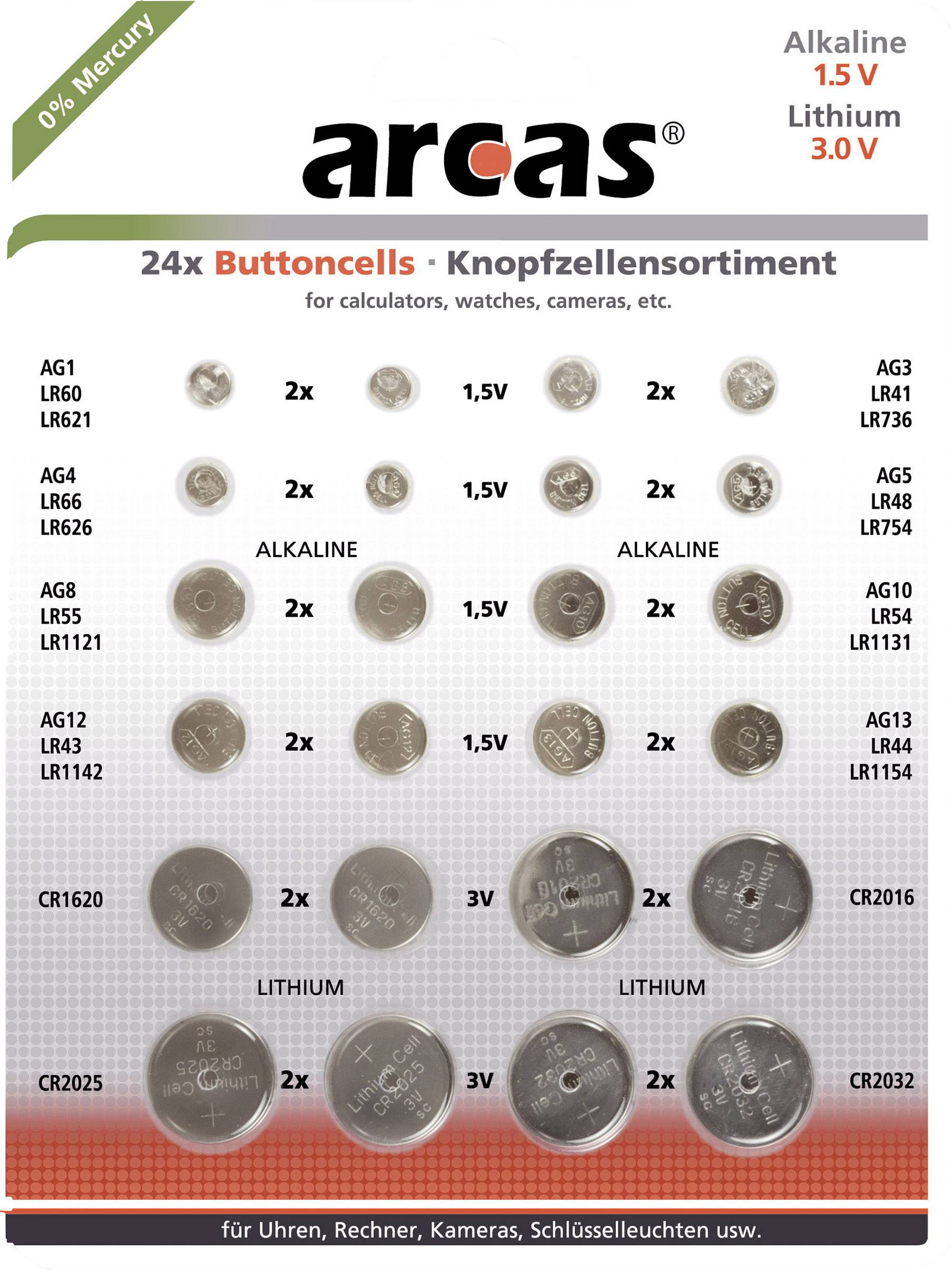 Arcas Knopfzellen-Set je 2x AG1, AG3, AG4, AG5, AG8, AG10, AG12, AG13, CR1620, CR2016, CR2025, CR2032