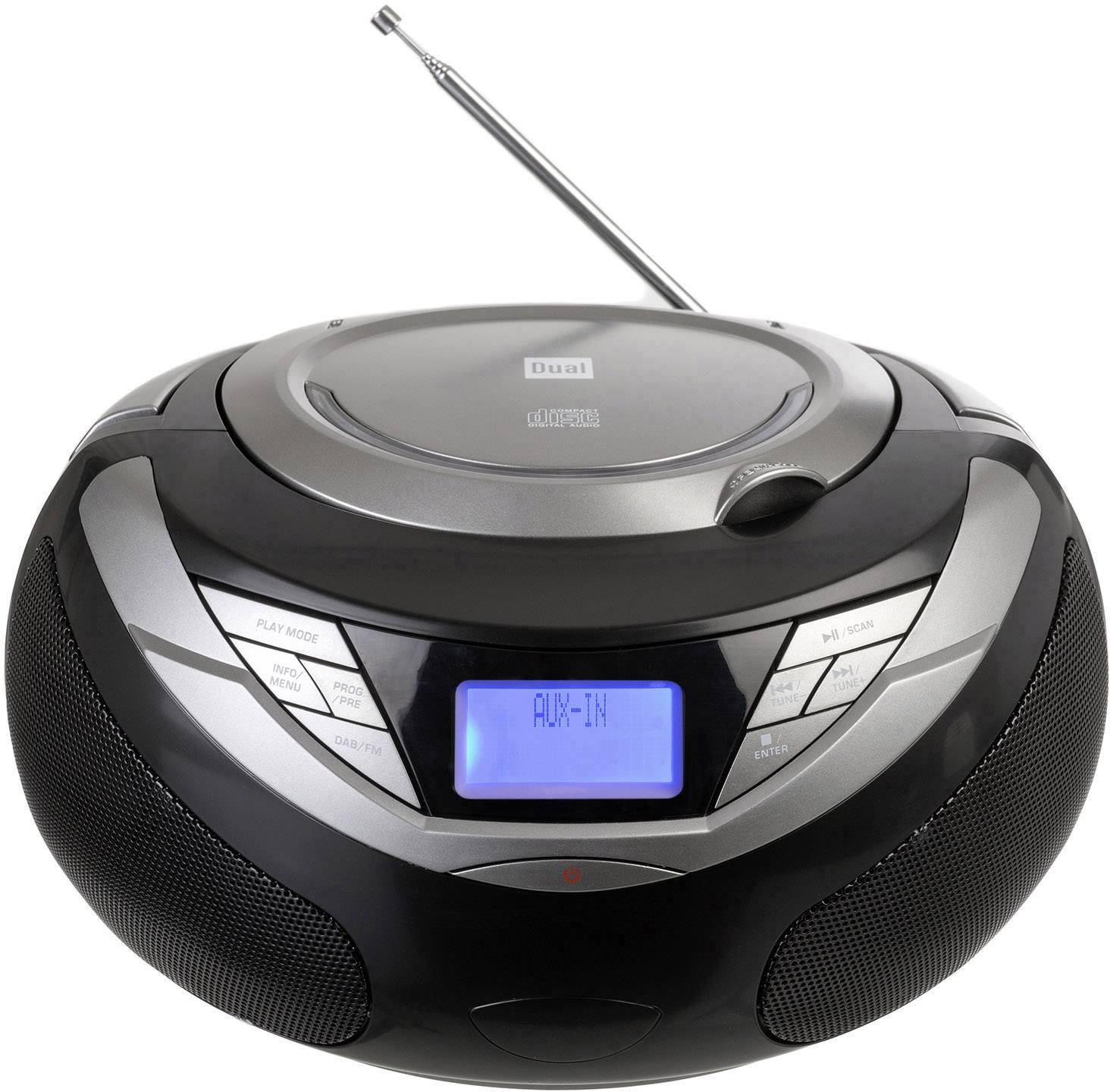 Mit dieser kompakten Boombox der Marke Dual können Sie Ihre Lieblingsradiosender sowohl analog über UKW, als auch digital mittels DAB(+) empfangen. Somit können Sie Ihr Radioprogramm in bester Qualität genießen und sind für den neuesten Standard gerüstet. Der automatische Suchlauf unterstützt Sie beim Einstellen der Programme. Über den Top-Loading-CD-Player haben Sie die Möglichkeit Ihre Lieblingsmusik von CD zu hören. Das Gerät verfügt zudem über eine Zufallswiedergabefunktion sowie einer Titel- und Albumwiederholfunktion. Das blau beleuchtete LC-Display auf der Gerätevorderseite zeigt Ihnen dabei an, welcher Titel wiedergegeben wird. Über den AUX-In-Eingang können Sie auch weitere Audiogeräte anschließen und Musik wiedergeben lassen. Die Stromversorgung erfolgt wahlweise über das mitgelieferte Netzkabel oder aber über 6 Batterien (6 x 1,5 V, BABY, LR14/C, nicht im Lieferumfang enthalten). Diese 6 Batterien werden an der Gehäuseunterseite eingelegt und durch den Deckel sicher verschlossen.