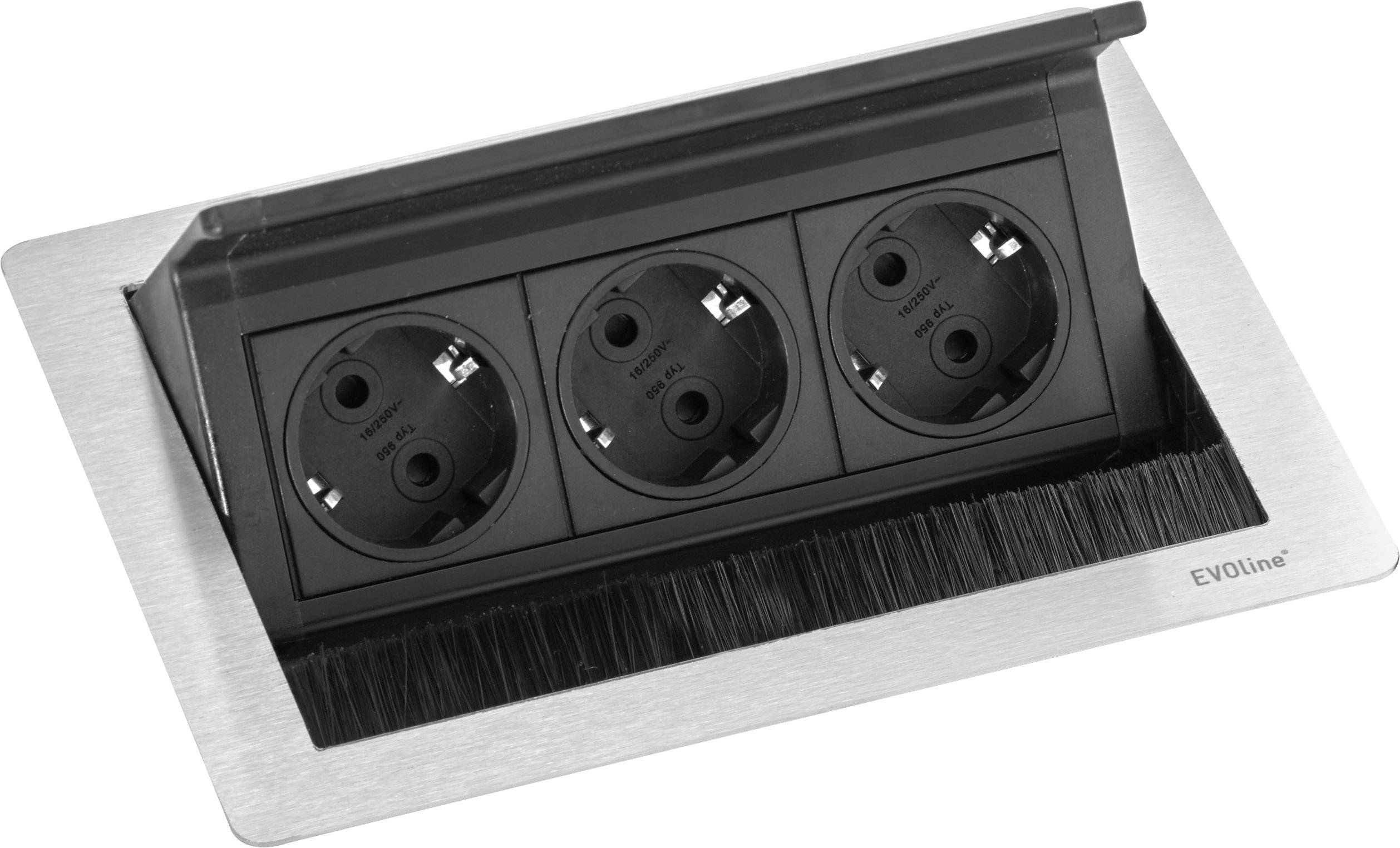 Zum Einbau in Arbeitsplatten bis 50 mm Stärke. Drei VDE-Steckdosen, 60°, 16 A mit Berührungsschutz. Festes Netzanschlusskabel 3,0 m mit Winkelstecker. Abdeckung öffnet sich durch leichtes Antippen automatisch; die Endposition wird durch leichtes Hochheben bis zum Einrastpunkt fixiert. Bürstenleiste in schwarz. Gehäuse aus schwarz eloxiertem Aluminium, Abdeckung und äußerer Rahmen aus gebürstetem Edelstahl.