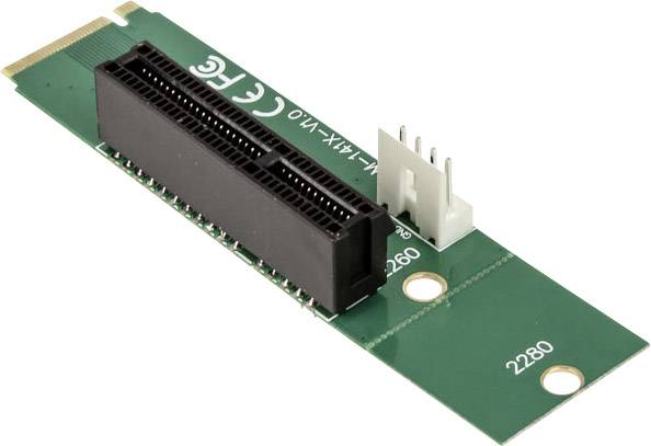 Dieser Adapter kann direkt in einen 2260- oder 2280-M.2-Slot gesteckt werden. Das angebundene PCIe-Signal wird somit bequem auf einen PCI Express-Anschluss umgelegt. Hier können PCIe-Steckkarten mit bis zu vier Lanes bzw. 64 Kontakten angebunden werden. Durch die Abwärtskompatibilität sind auch PCIe x1-Steckkarten verwendbar. Da Grafikkarten fürs Minen nur mit einer PCIe-Lane angeschlossen werden müssen, können diese auch über den M.2-Slot betrieben werden. Hierfür ist ein zusätzlicher Riser (z. B. Kolink ZURC-007 Conrad BN 1591795) notwendig, der einen PCIe x16-Slot bereit stellt.