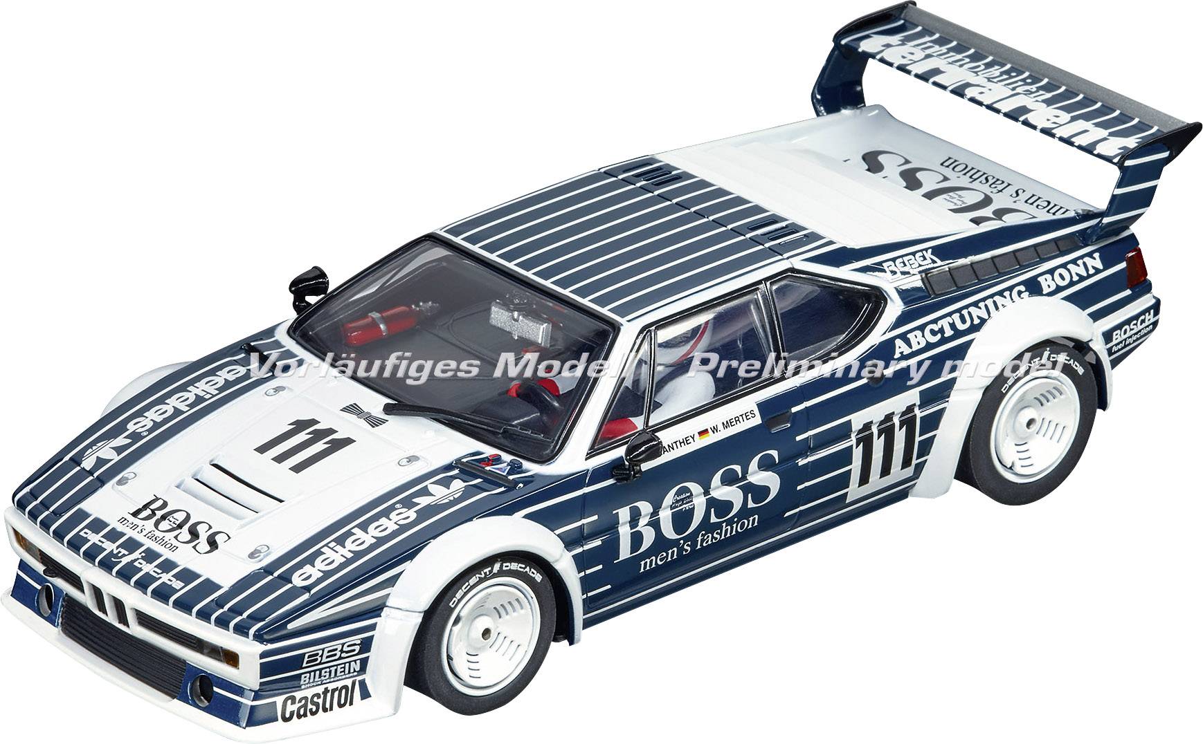 Der BMW M1 Procar im dunkelblauen Nadelstreifenlook wurde 1979 und 1980 vom Rennfahrer Franz Ostermaier bei der Procar-Meisterschaft von BMW gefahren. Das Rennauto beschleunigt von 0 auf 200 km/h in 25,4 Sekunden bei einer Höchstgeschwindigkeit von 265 km/h. Das Carrera DIGITAL 132 BMW M1 Procar "Ostermaier Racing, No.111" Slotcar begeistert durch Frontlicht und Rück- / Bremslicht sowie eine originalgetreue Verarbeitung. Das Carrera Auto ist individuell codierbar, digital steuerbar und bietet echten Fahrspaß.