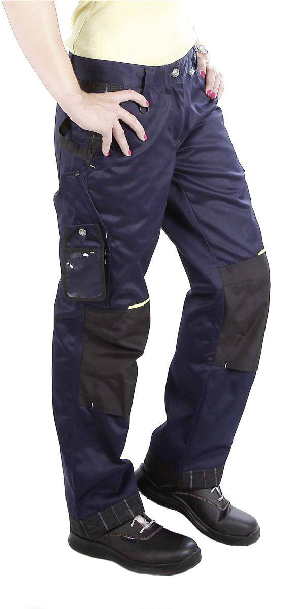 Schicke, strapazierfähige und pflegeleichte Bundarbeitshose mit idealer Passform für Damen und modischen farbigen Applikationen · 2 seitliche Eingrifftaschen · 1 aufgesetzte Tasche mit Patte und Druckknopf · 1 Handytasche mit Klett und aufgesetzte Oberschenkeltasche · 1 Zollstocktasche mit Stiftehalterung · Bund mit Gürtelschlaufen · Kniepolstertaschen mit neongelben Reflex-Pipings · Spezielles Ausweissichtfenster · YKK Front-Reißverschluss.