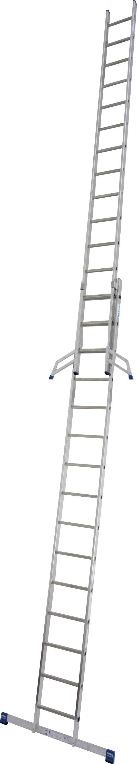 Zweiteilige Sprossenleiter für große Arbeitshöhen · 16-fache Spreizung der Sprossen/Holm-Verbindung sorgt für besonders hohe Stabilität und Langlebigkeit · Holme aus Alu-Pressprofil · Rundum profilierte Sprossen und rutschfeste Zweikomponenten-Fußstopfen gewährleisten ein hohes Maß an Sicherheit · Führungs- und Beschlagteile aus hochlegiertem Aluminium · Holmumgreifende Führungsbeschläge mit integrieren Gleitteilen sorgen für hohe Stabilität und Sicherheit · Selbstsichernde Einrasthaken verhindern das ungewollte Auseinanderfallen beim Transport · Beide Leiternteile auch einzeln einsetzbar.