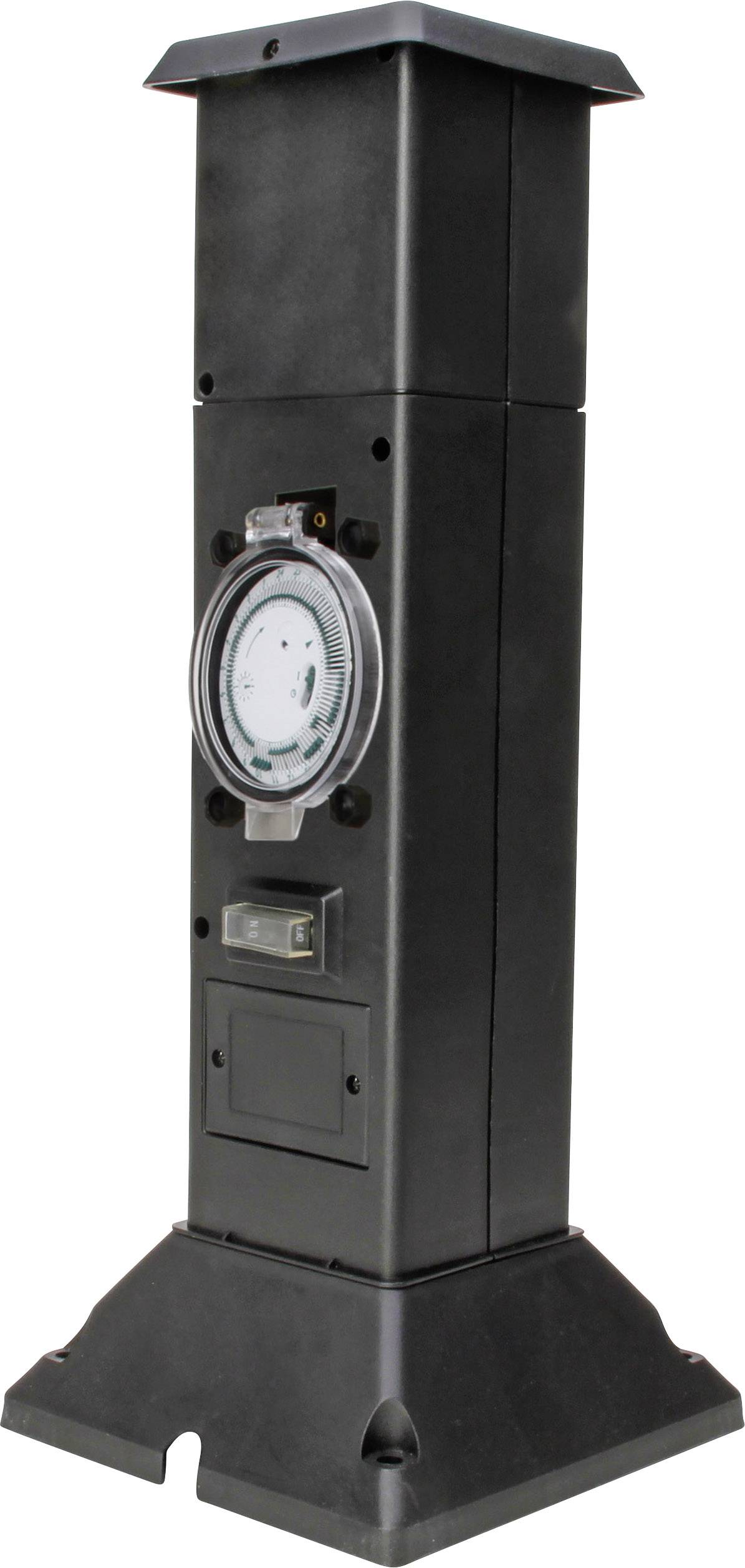Mechanische Zeitschaltuhr · 2 Ein/Aus Schalter · 2 selbstschließende Klappdeckel.