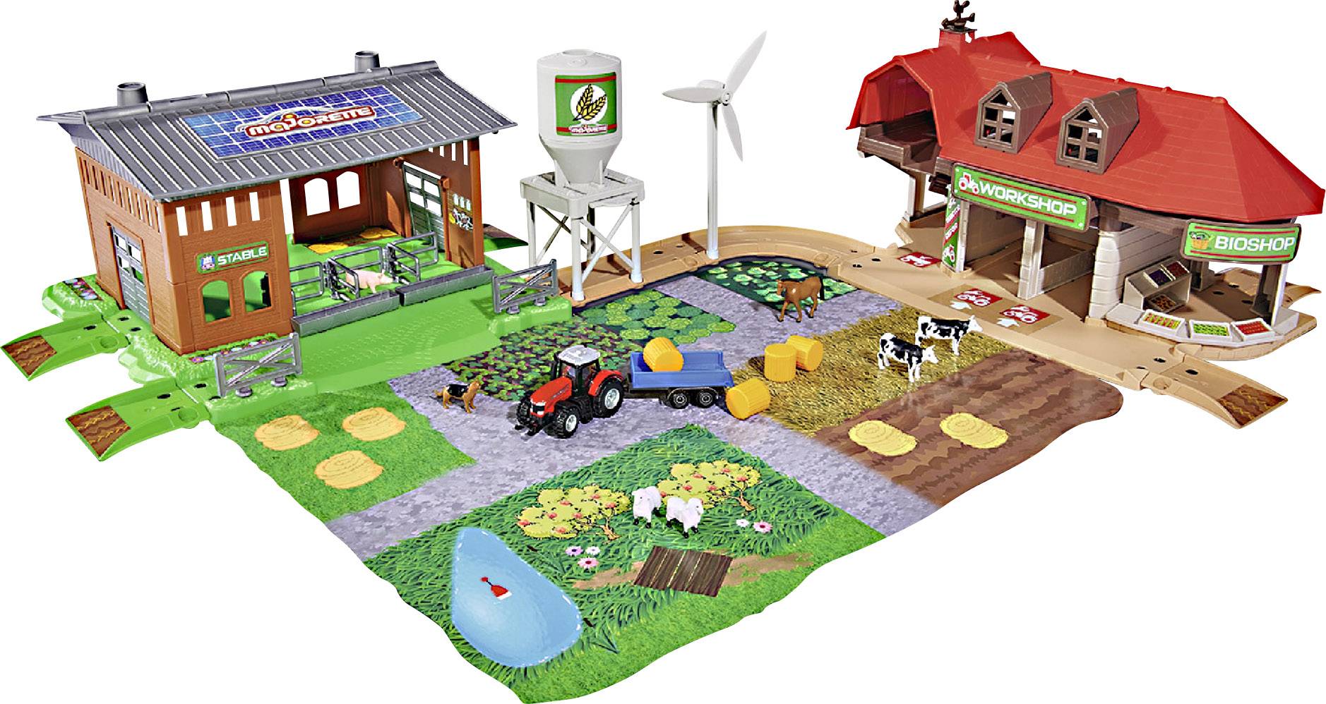 Majorette Creatix Farm Playset: Willkommen auf dem eigenen Bauernhof! Der Majorette Creatix Spielzeugbauernhof ist ein Spielset, das mit vielen Funktionen und umfangreichem Zubehör die Welt der Landwirtschaft abbildet. Die Farm besteht aus verschiedenen Häusern, frei platzierbaren Straßenteilen und fünf verschiedenen Diecast Landwirtschaftsfahrzeugen mit Anhänger. Die einzelnen Fahrzeuge und Anhänger lassen sich in diversen Varianten zusammenfügen. Die Spielzugtrecker in robuster Fertigung bestehen aus hochwertigem Metall, die Farm aus Kunststoff. Tiere, ein Heu-Lift, eine Traktoren-Werkstatt, ein Bio Shop, ein Silo und eine Windmühle vervollständigen diesen hochwertigen Spielzeugbauernhof. Dieses Spielset aus der Creatix-Serie von Majorette lässt sich mit anderen Sets individuell zu einer großen Spielwelt erweitern. Damit ist die Spielzeugfarm eine vielfältige Bereicherung.