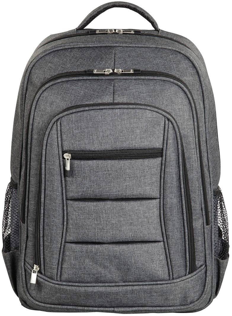 Ideal für Büro, Uni oder unterwegs in der Stadt bietet der schicke Notebook-Rucksack bequemen Transport, sichere Aufbewahrung und Schutz vor Schmutz, Kratzern und Feuchtigkeit für Notebook plus Zubehör · Zusätzliches Dokumentenfach im Hauptfach · Drei zusätzliche Vordertaschen · Zwei Netztaschen seitlich · Angenehmer Handgriff · Material: Polyester · Farbe: Grau