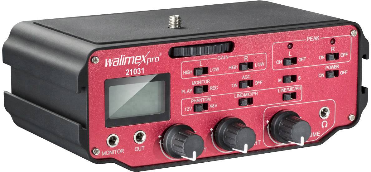 Der walimex pro Audio Adapter ist ein 2 Kanal XLR Adapter mit Vorverstärker und Phantomspeisung. Ideal für alle DSLR Kameras mit integrierter Mikrofonbuchse. Ein Display dient zur optischen Überwachung der Tonaufnahme. Zudem ist eine Vielzahl an Einstellmöglichkeiten zur Optimierung der Tonqualität vorhanden. Der Audio-Adapter lässt sich ganz einfach von unten über ein 1/4 Zoll Gewinde an der Kamera befestigen. Über die beiden integrierten Mini-Rais lassen sich problemlos Mikrofone, kabellose Empfänger oder Zubehör befestigen