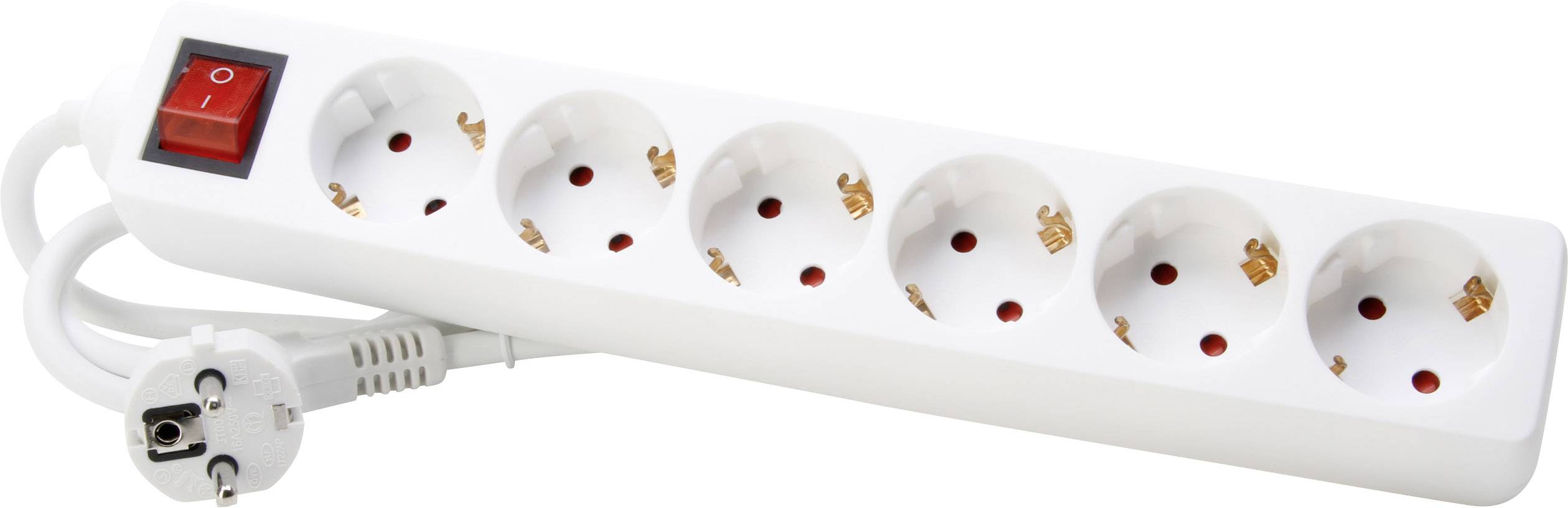 6-fach Steckdosenleiste mit Schalter und 45° gedrehten Töpfen; mit erhöhtem Berührungsschutz. Kabellänge: 1,4 m